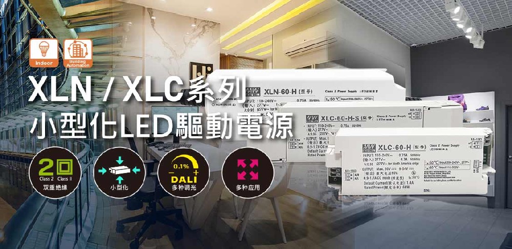 • XLN和XLC系列為明緯最新一代塑膠殼類(lèi)LED驅(qū)動(dòng)電源,符合雙重絕緣及ClassII/2設(shè)計(jì),可提供一般室內(nèi)及商業(yè)照明燈具做搭配使用,具備多種特點(diǎn)包含小型化尺寸、恒壓及恒流輸出、多種調(diào)光功能、出線(xiàn)式或端子式接線(xiàn)...等