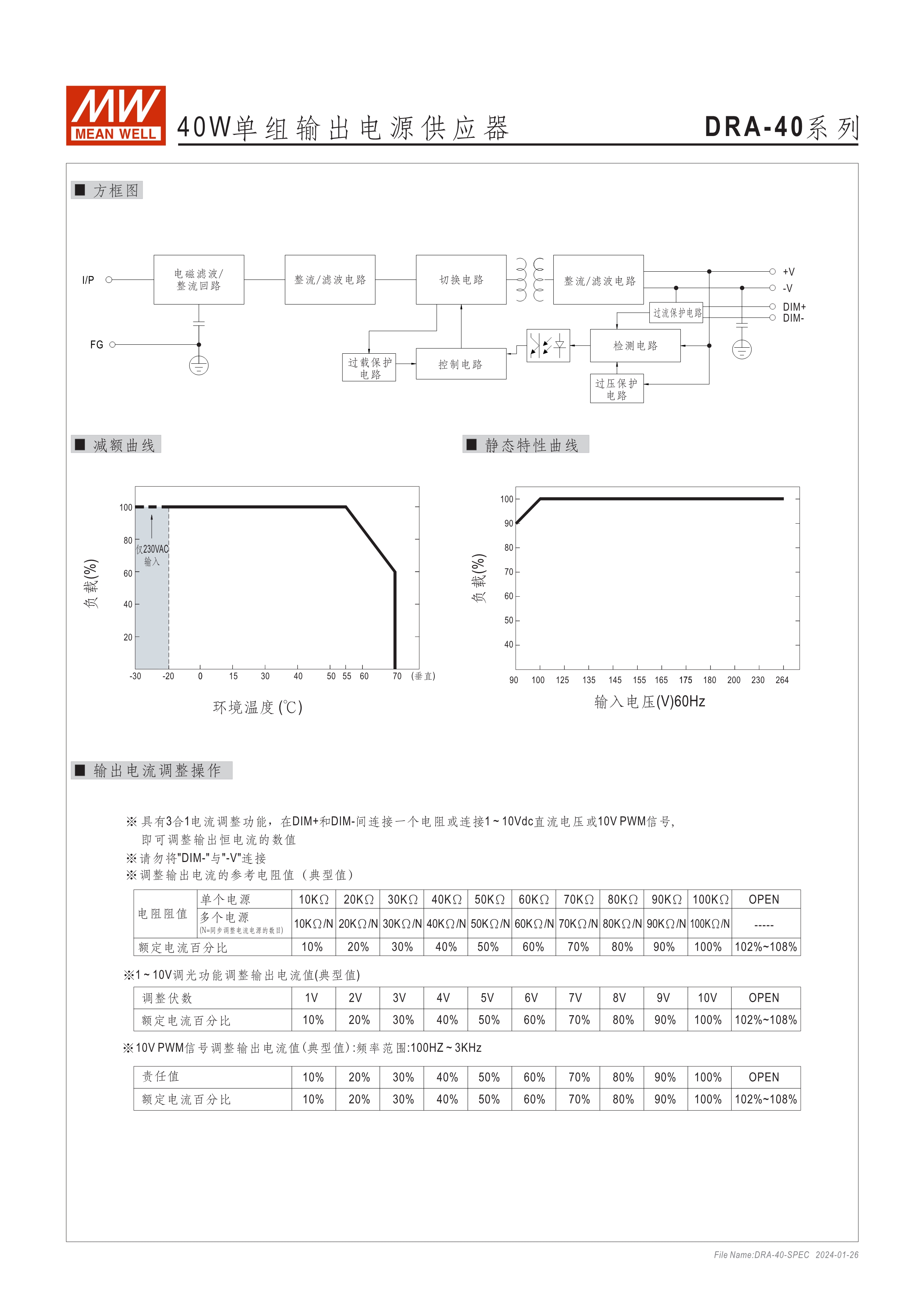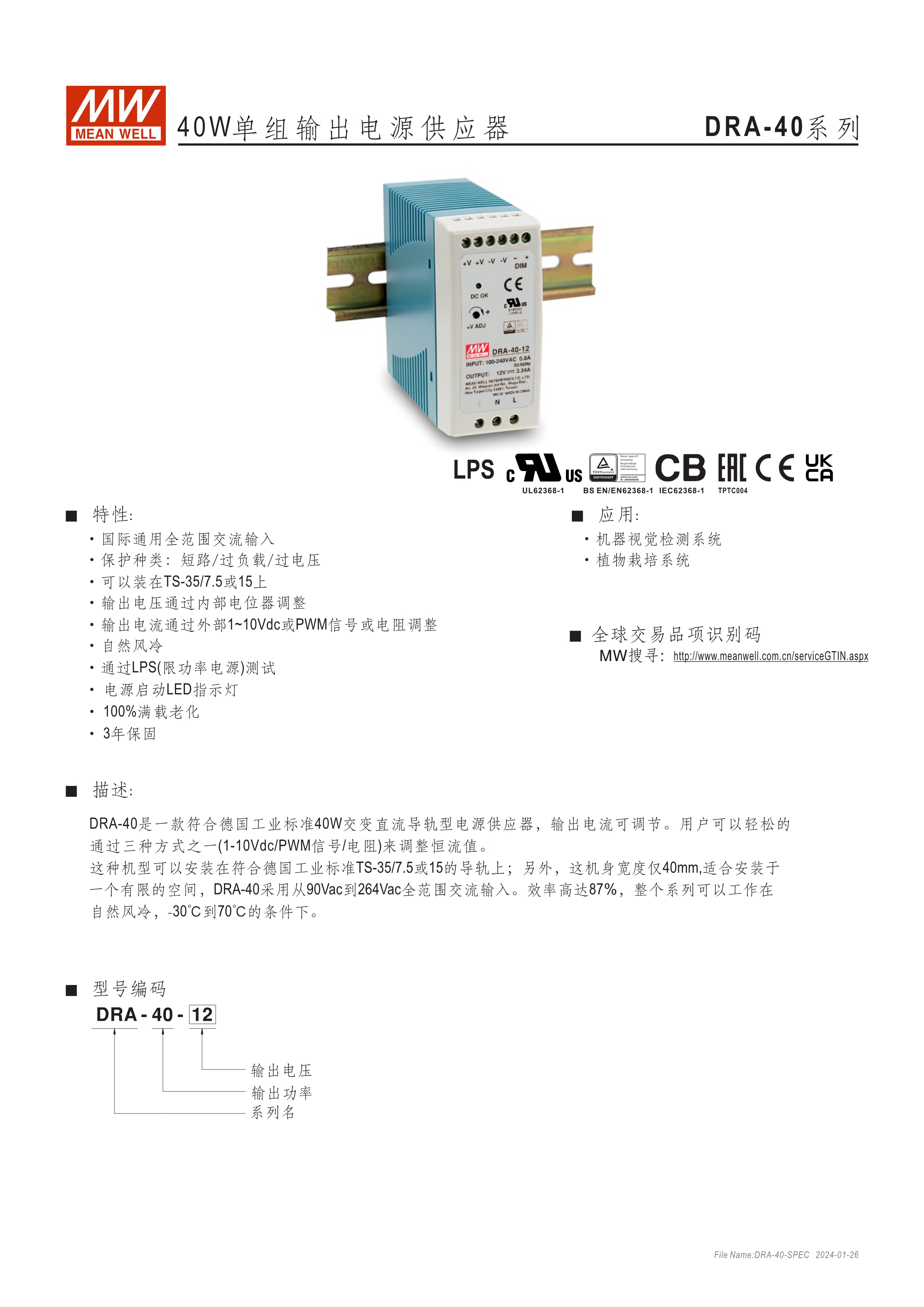 塑料機(jī)殼 單相,全范圍輸入 輸出電流可透過1~10VDC, PWM信號(hào)或電阻調(diào)設(shè)于原額定值的 10~100% 適合安裝于DIN Rail TS-35 / 7.5或15 適合于視覺檢測(cè)設(shè)備及植物栽培系統(tǒng)