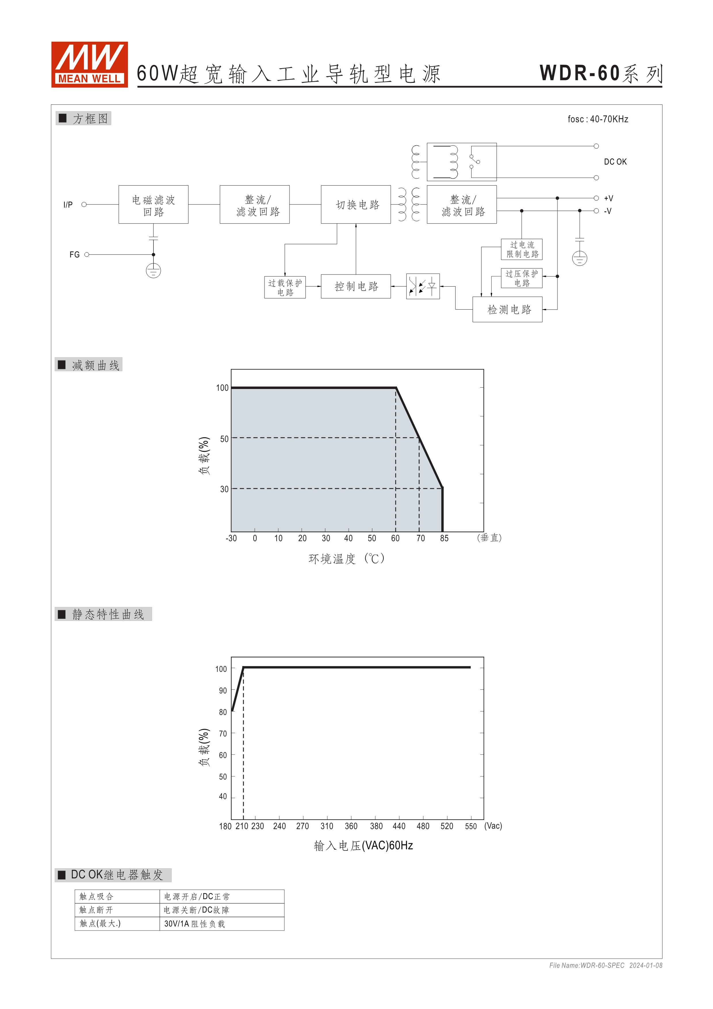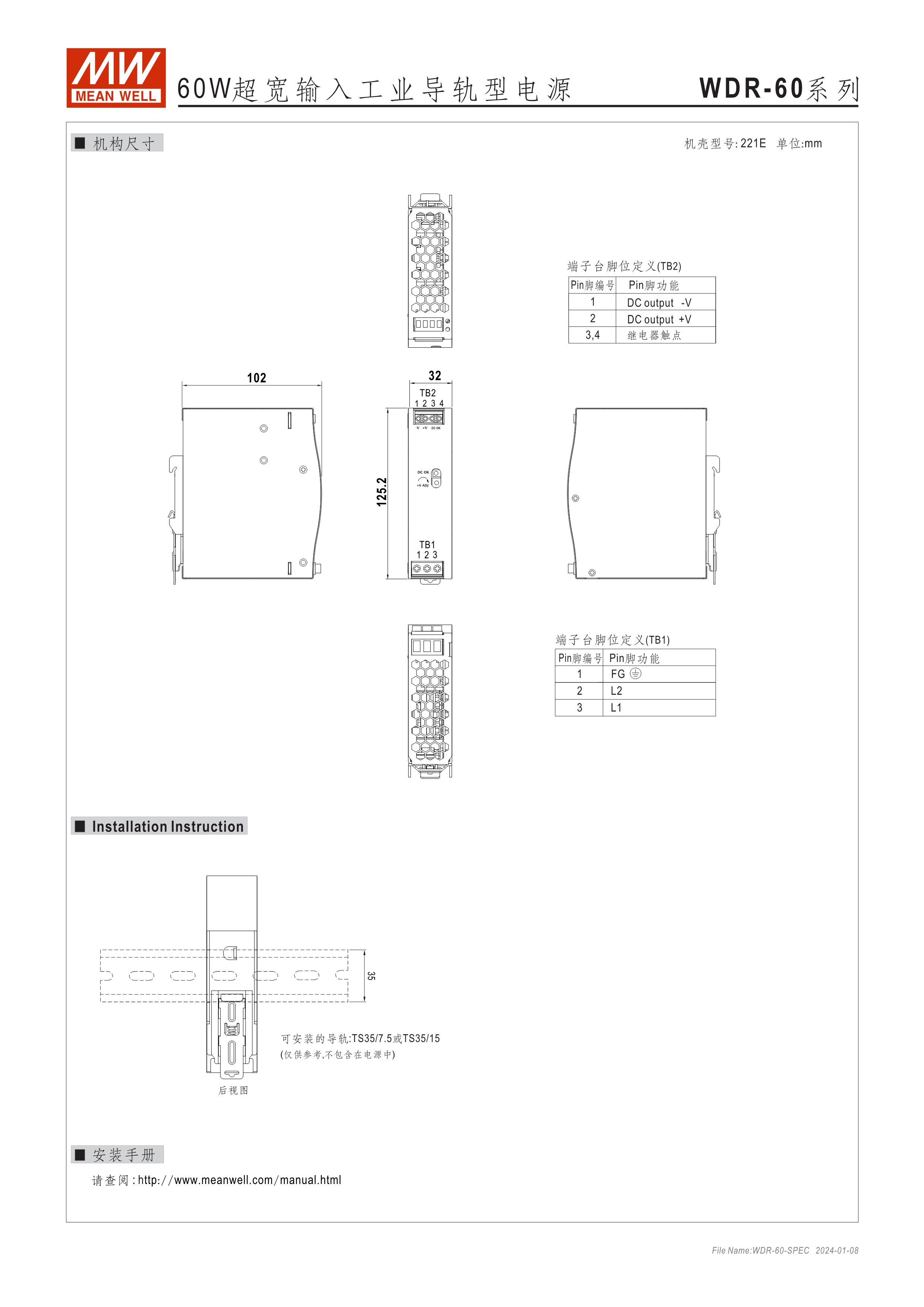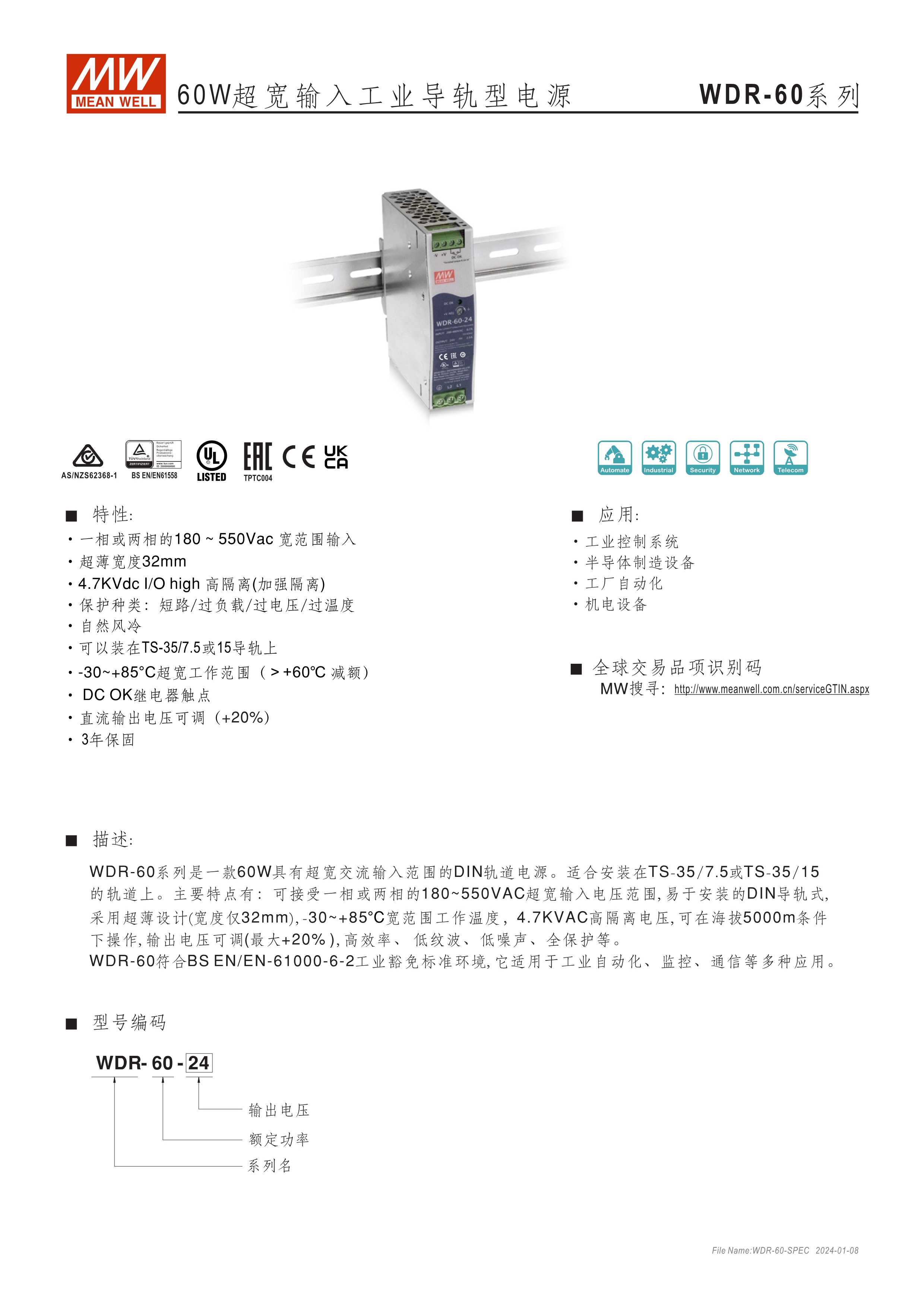 金屬殼,薄型設(shè)計(jì) 單相及雙相, 180~550VAC寬輸入范圍 高工作效率達(dá)93% 240W及480W內(nèi)建主動式功率因子矯正功能(active PFC) 適合安裝于DIN rail TS-35 / 7.5 或 15 內(nèi)建DC OK繼電器接點(diǎn)(Relay contact)