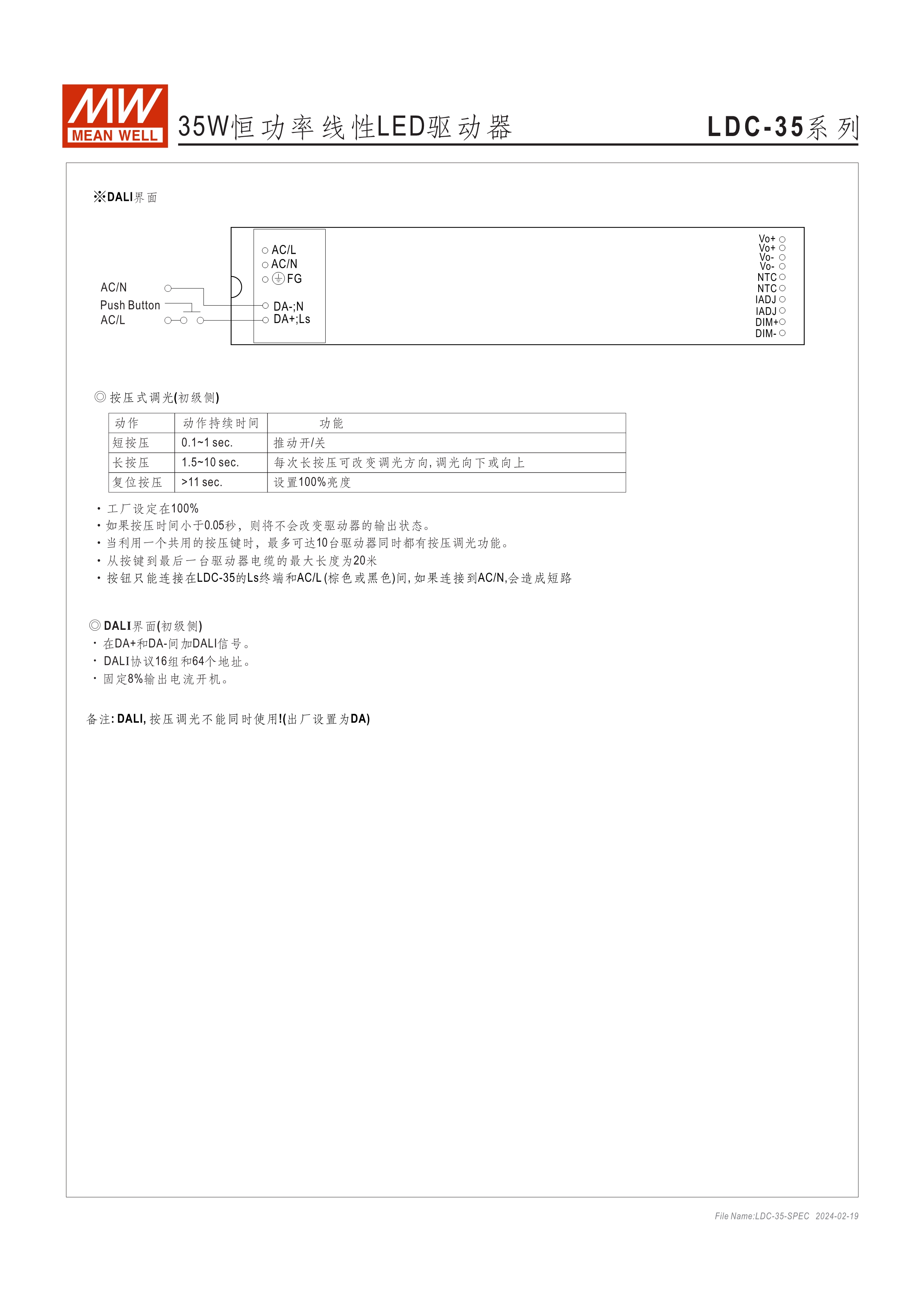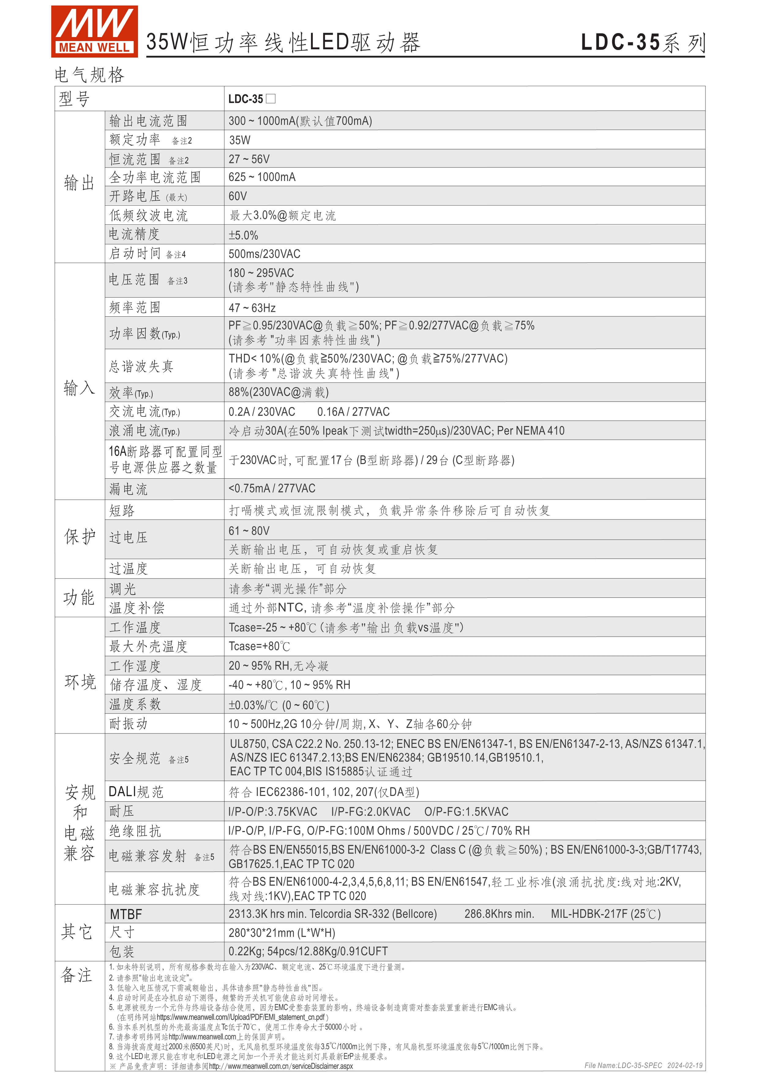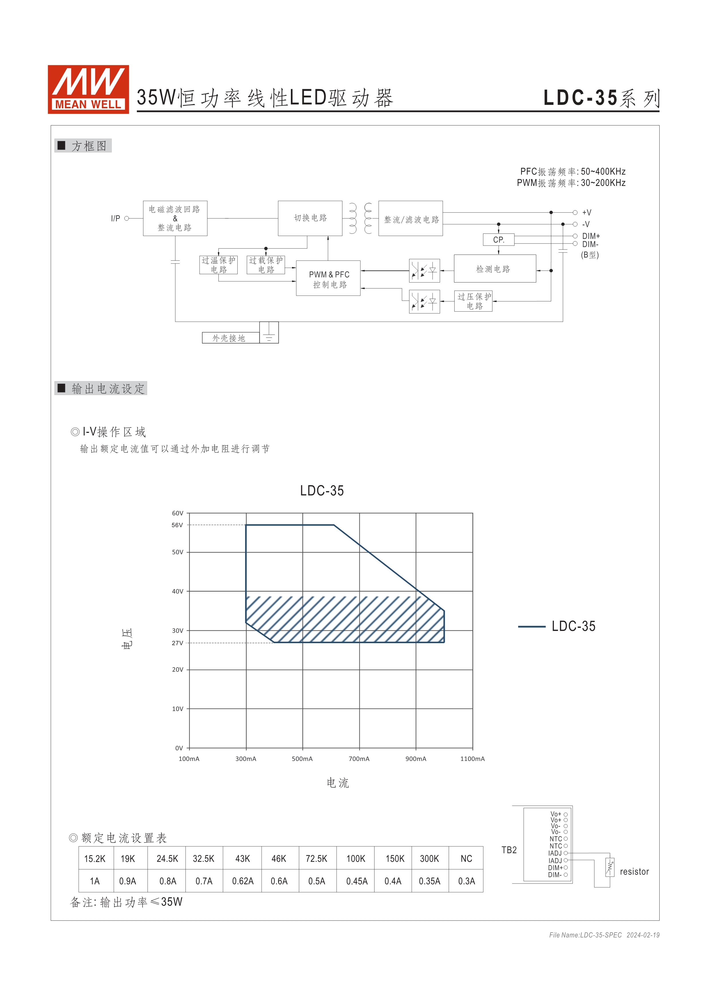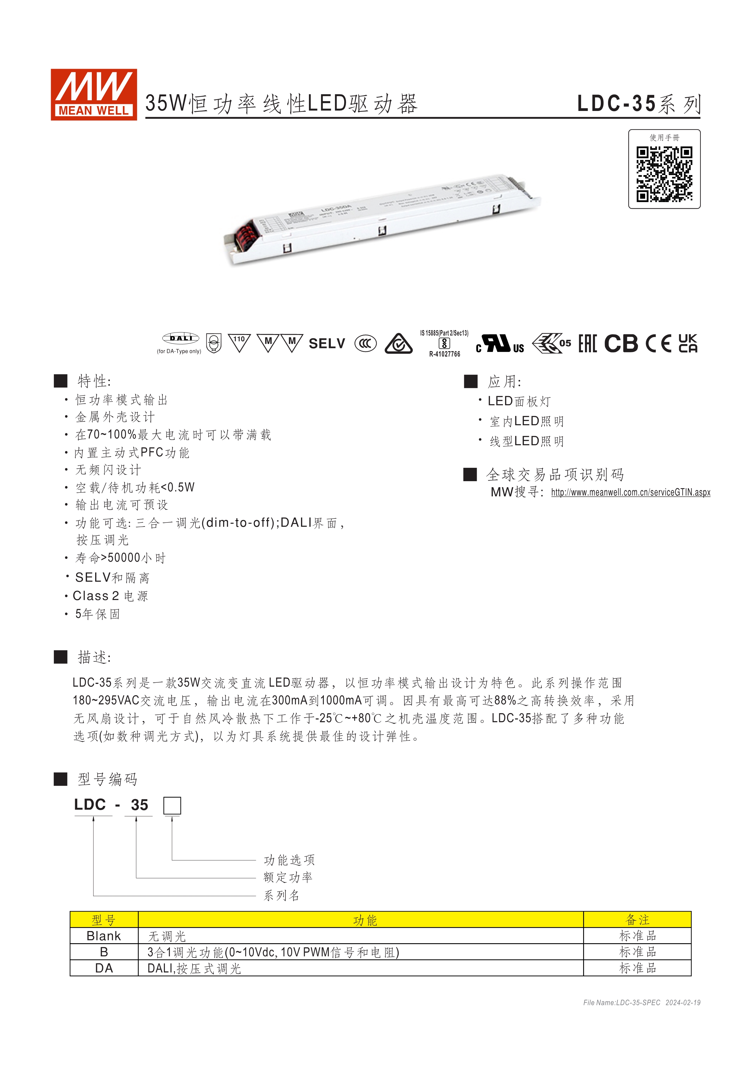 恒功率模式輸出,輸出電流可通過外接電阻設(shè)定 無頻閃設(shè)計(jì)(Fpcker free) 三合一調(diào)光功能:0~10Vdc、PMW調(diào)光、電阻調(diào)光 內(nèi)建主動(dòng)式功率因子矯正功能(Active PFC) 低空載功耗: <0.5W 工作溫度: -25~+90℃ 保護(hù)種類:短路 UL/ENEC/TUV/CCC/CB/CE 認(rèn)證齊全 5年保固