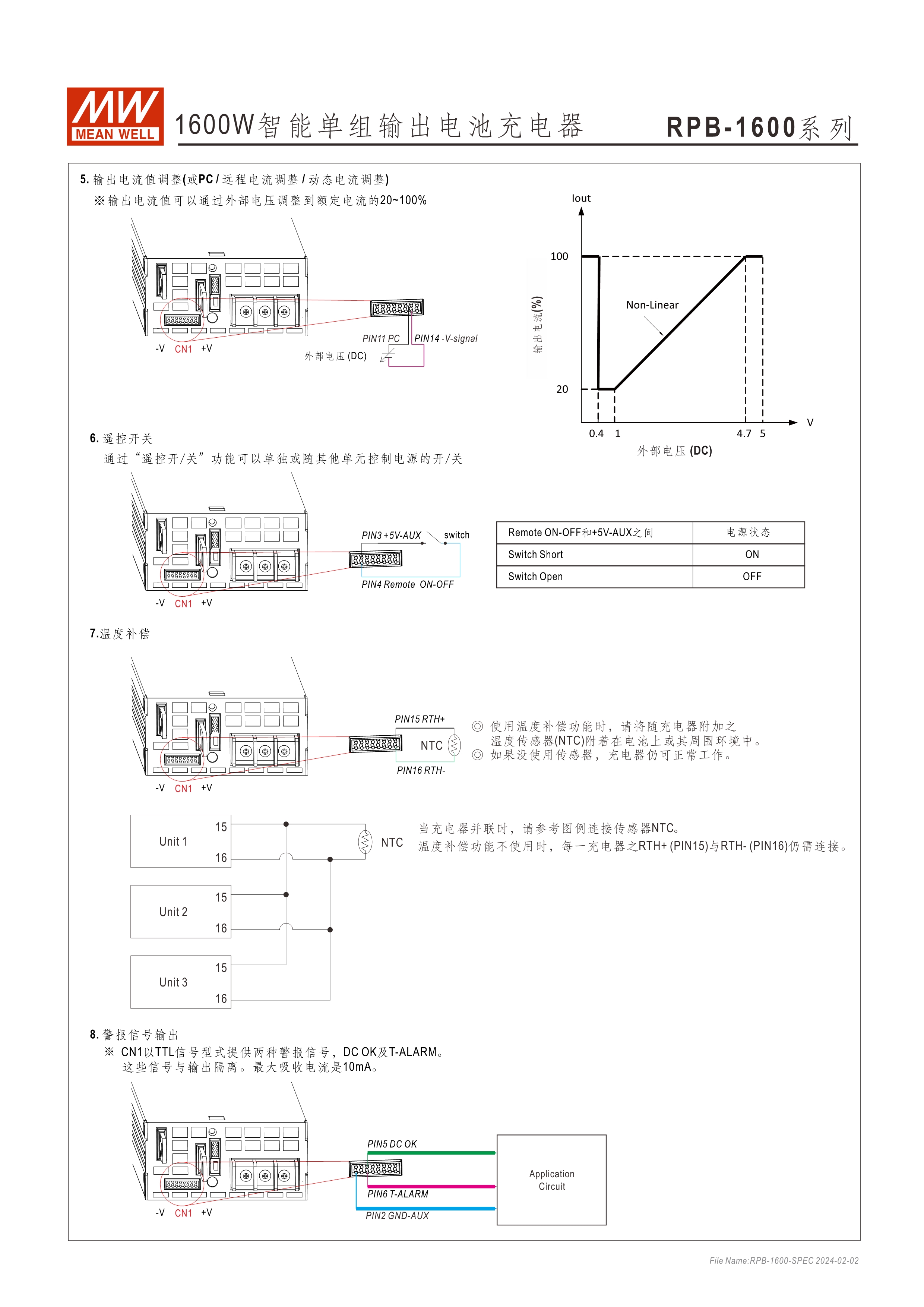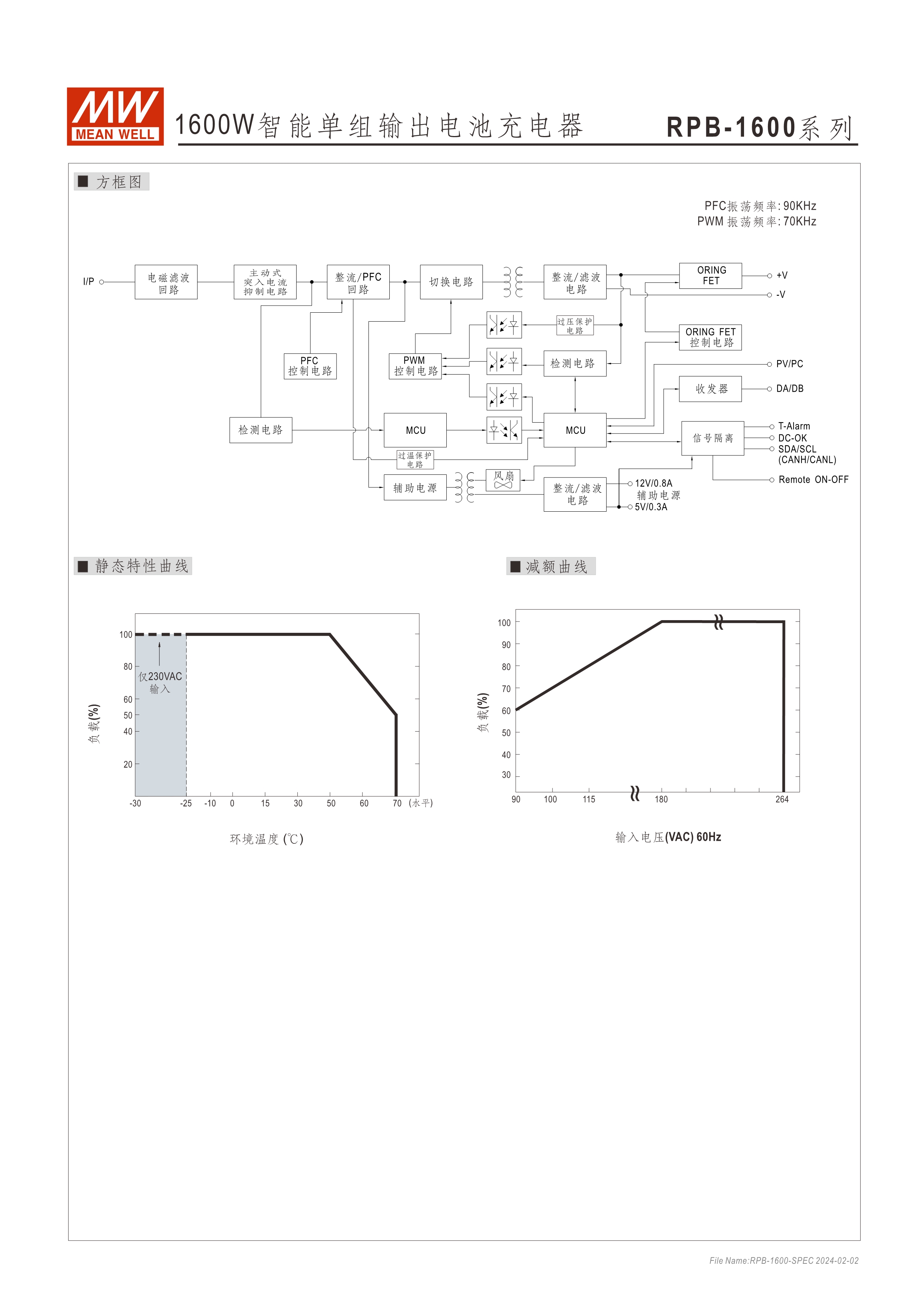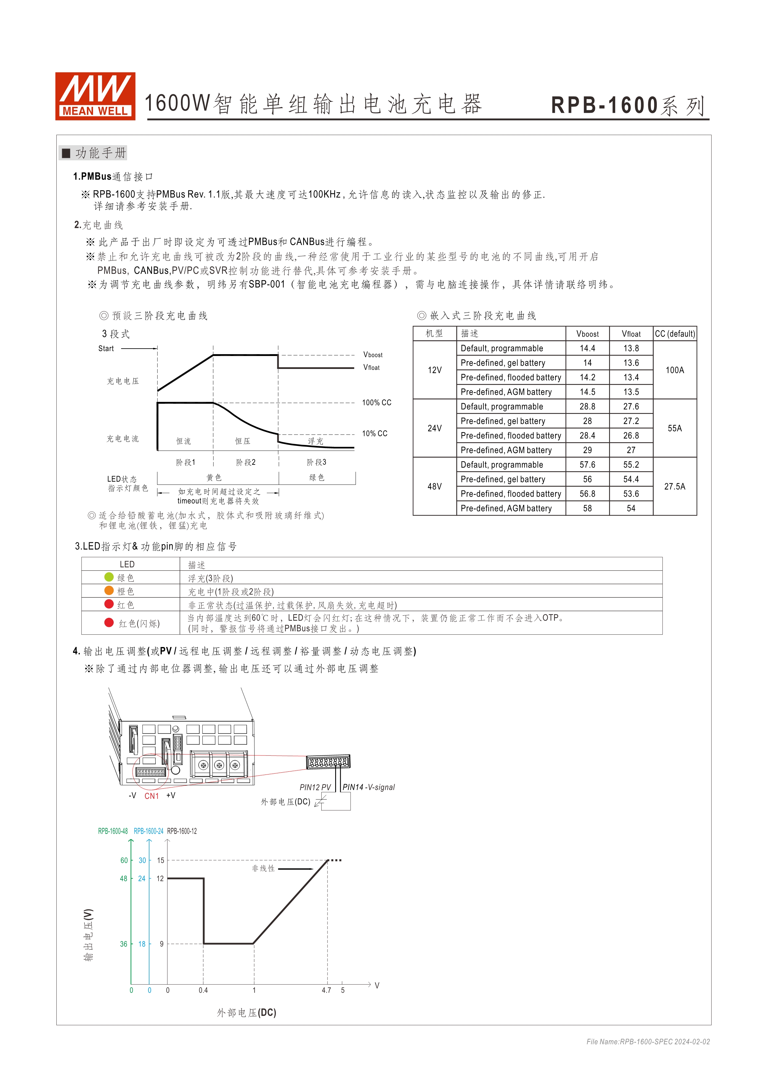 RPB/DBU系列:機殼型充電器 RCB/DBR系列:Rack機架型充電器 功率密度高達37W/in3 內建I2C/PMBus通訊介面 (CANBus選購) 搭配SBP-001編成器,可設定充電電壓/電流、2段或3段、停充時間 透過外加1~5Vdc,可調充電電壓75~125% (10.8~18V,21.6~36V, 43.2~72V) 藉由外加1~5Vdc,可調充電電流20~100% 內建OR_ing MOSFET,支援熱插拔 (僅RCB-1600/DBR-3200系列) 均流并聯(lián)最高可達25600W 保護功能:電池過低、未接好、短路、過溫度 通用鉛酸電池或鋰電池 5年保固