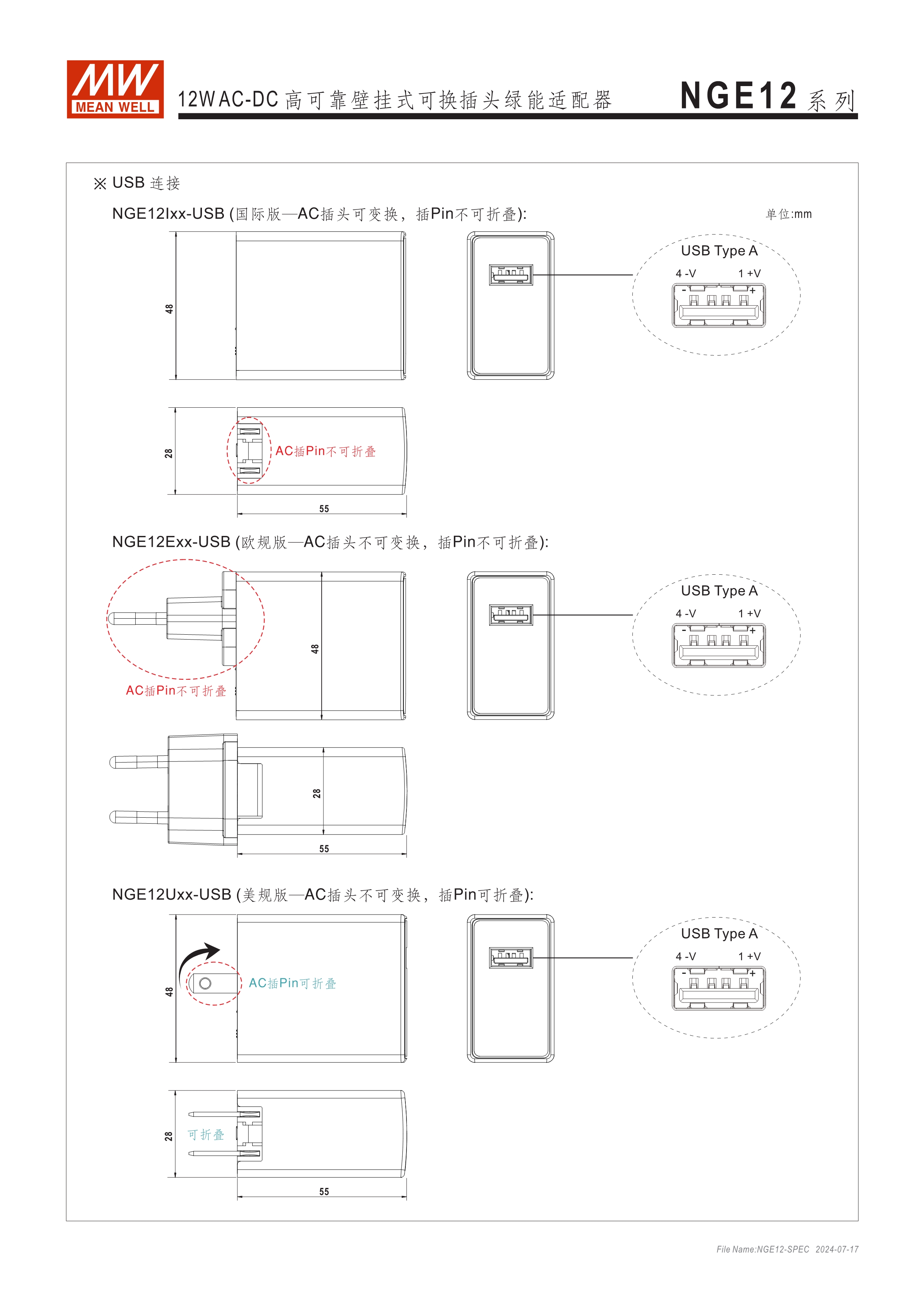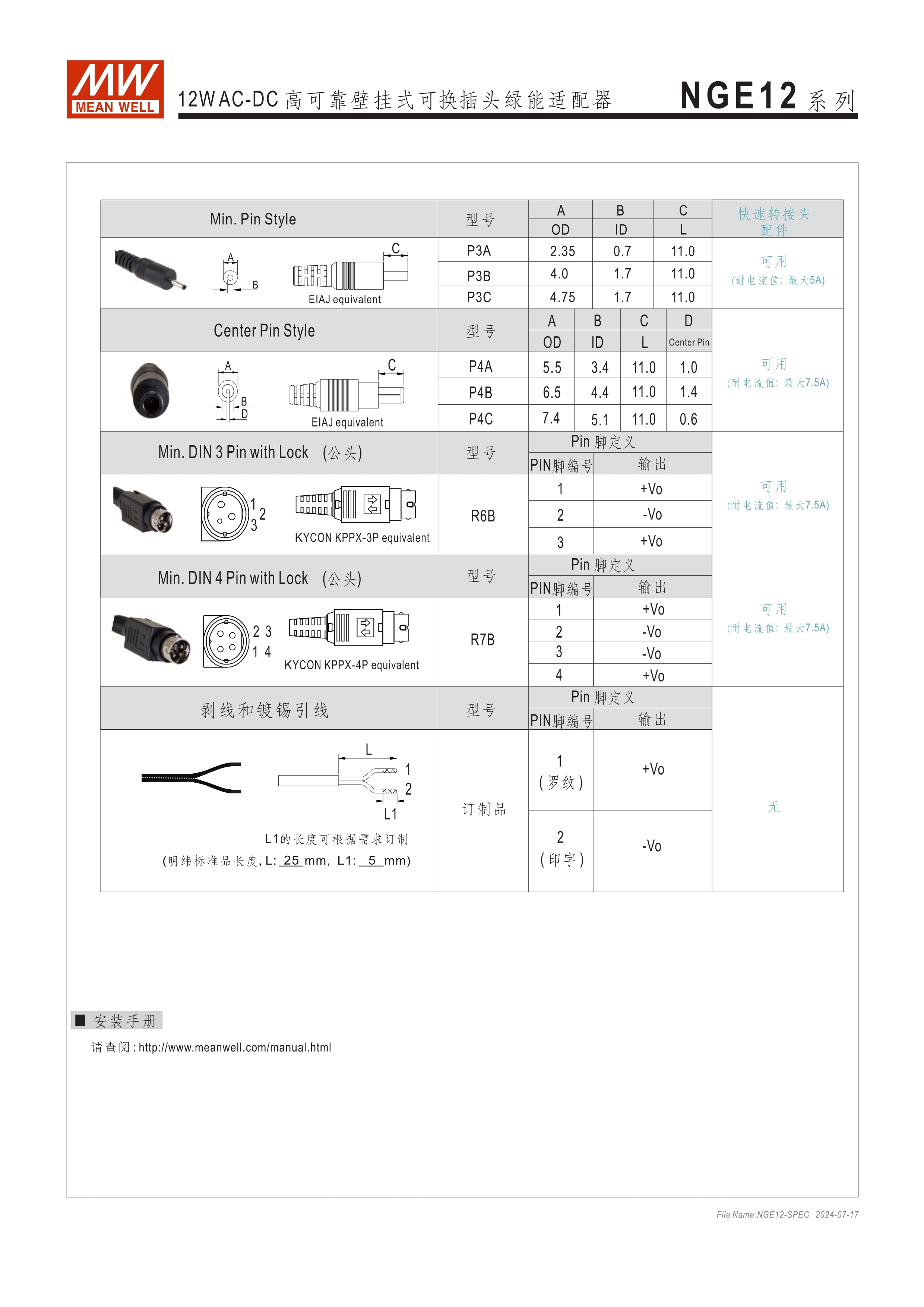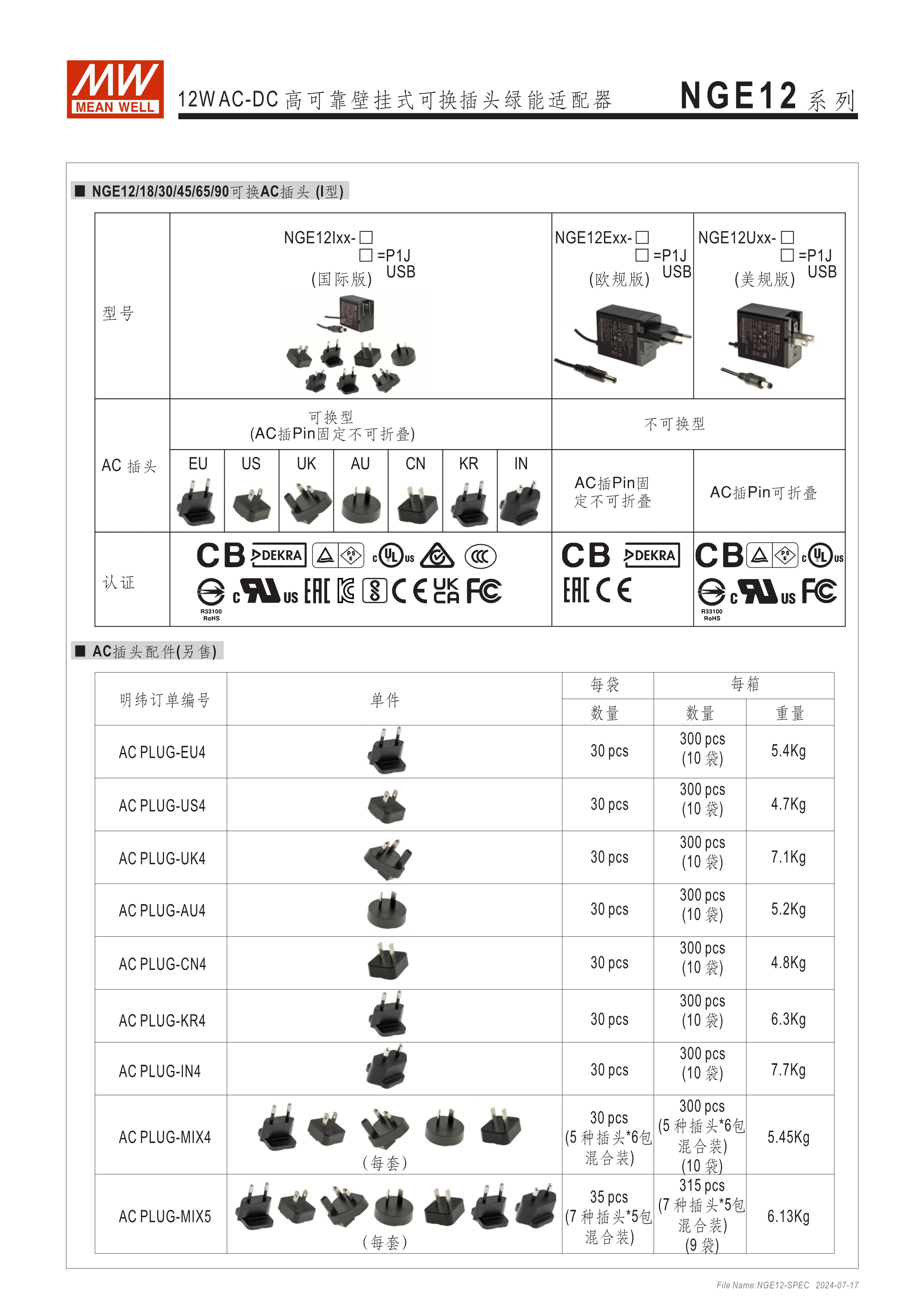 可換AC插頭 符合多領域全球認證 (信息類 62368-1、醫(yī)療 60601-1, 家用 60335-1、工業(yè) 61558-1/-2-16) 全范圍AC輸入 2xMOPP, BF應用 超窄面寬設計(28mm~30mm) 漏電流 <100uA 80~264V輸入 空載損耗<0.075W~0.1W 能效等級Level VII 保護功能:短路、過載、過電壓 漏電流 <100uA -30~70℃寬工作溫度 多種DC輸出轉(zhuǎn)接頭可更換 3年保固期