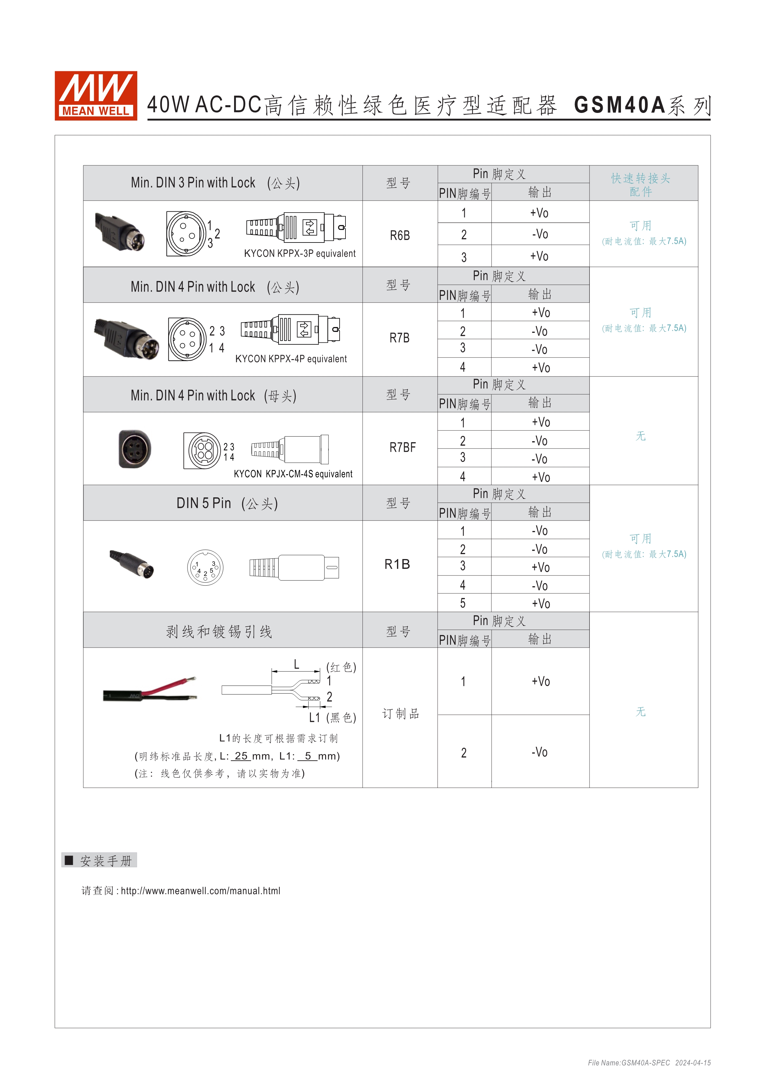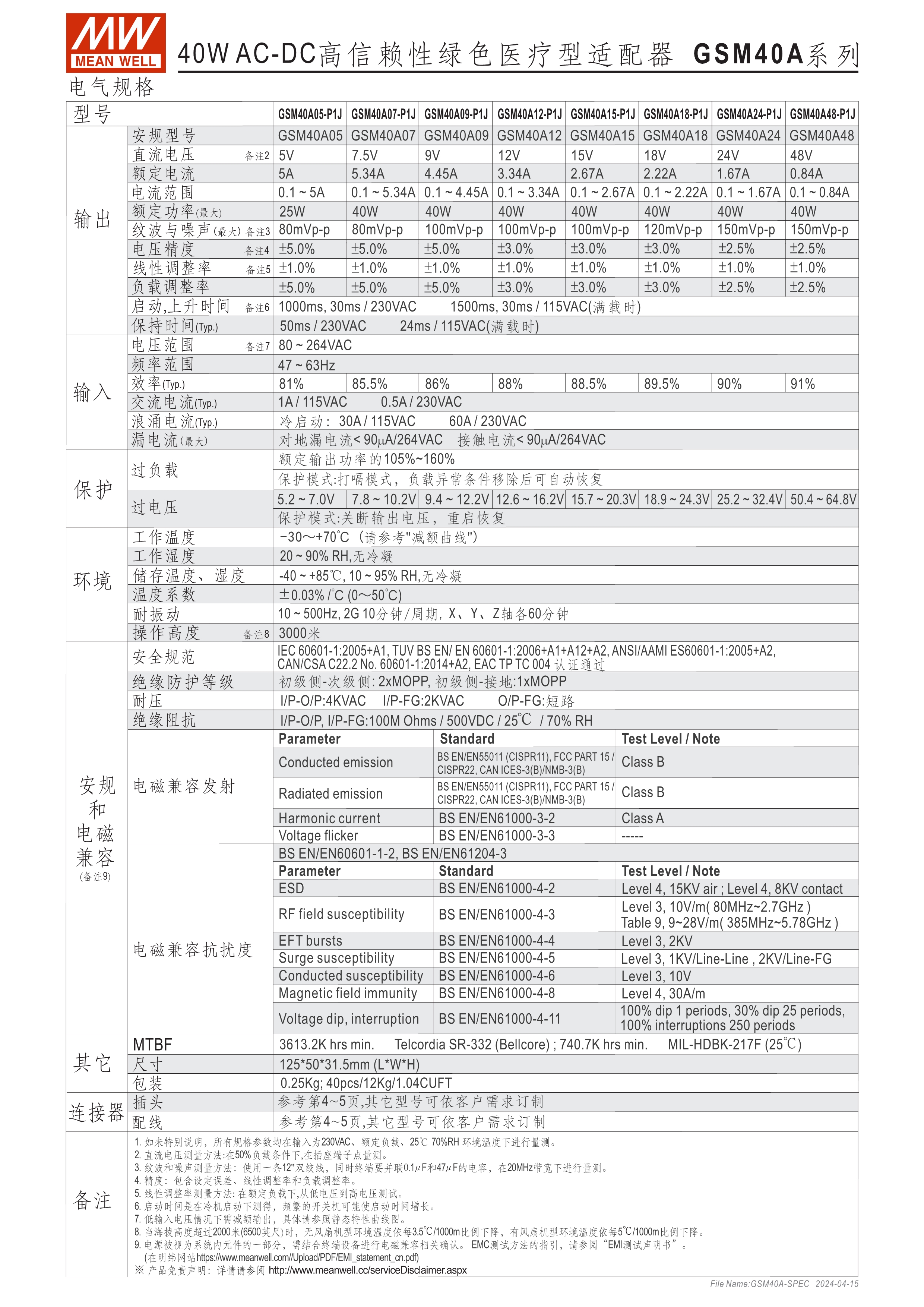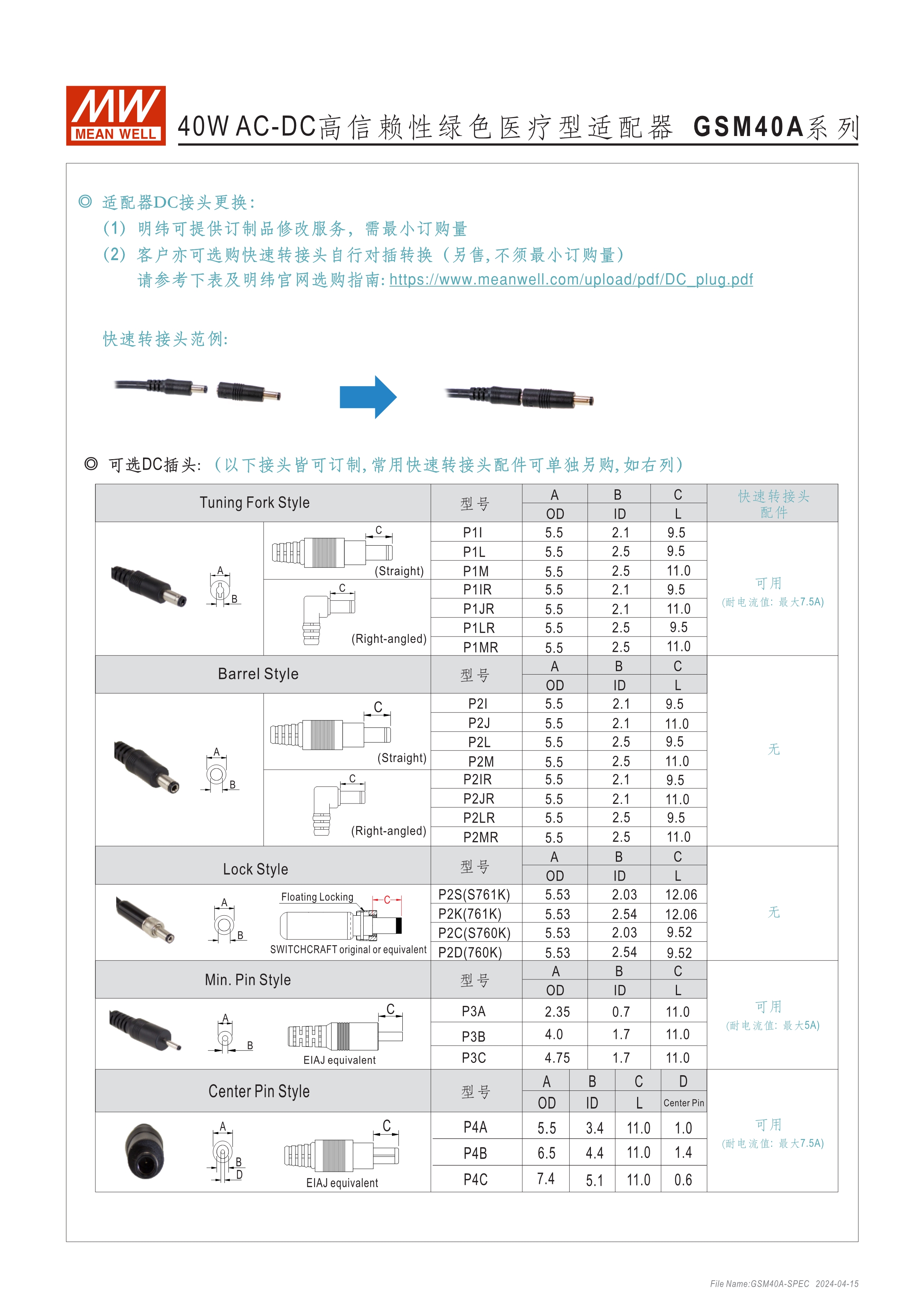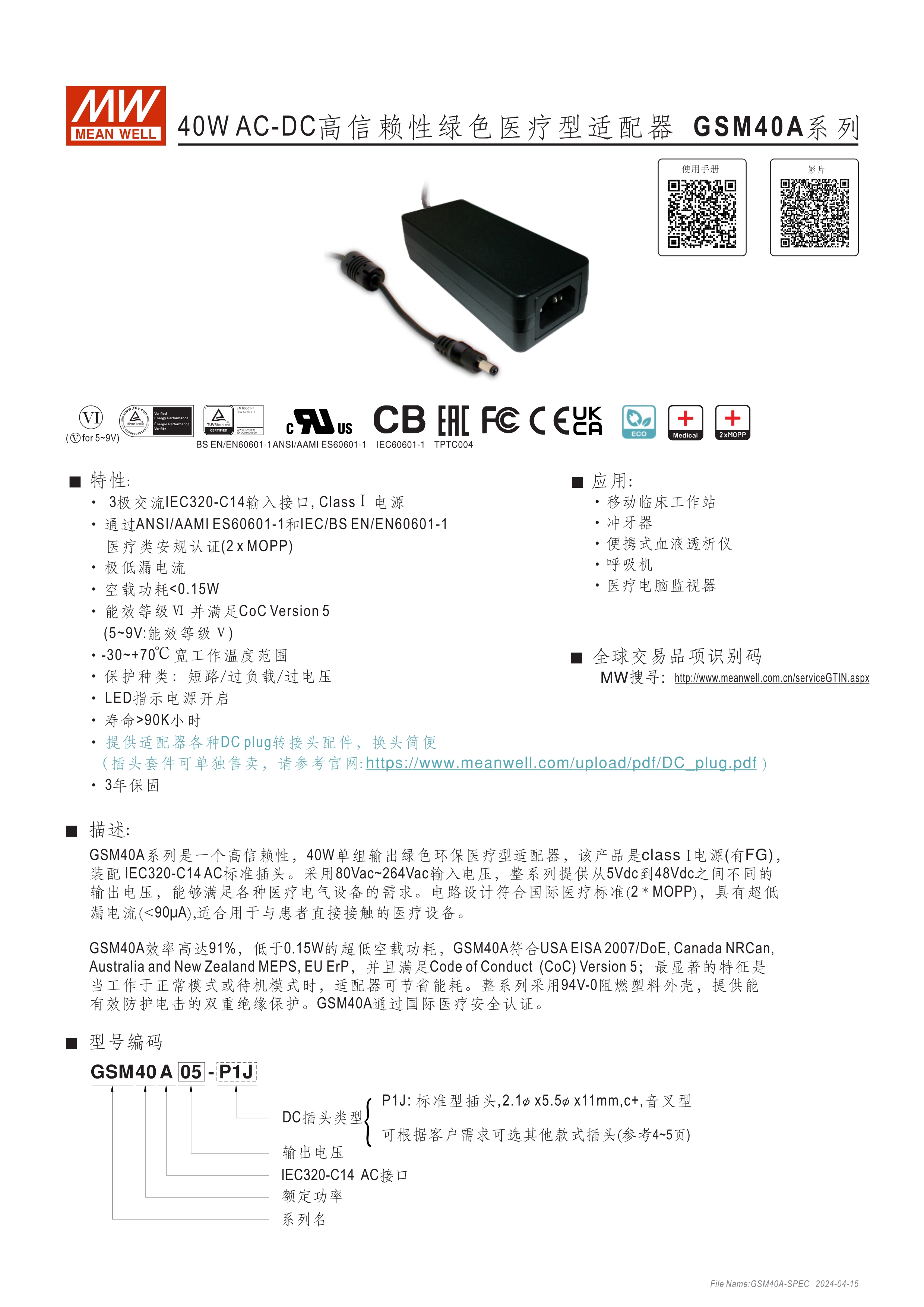 通過醫(yī)療60601-1認證(2xMOPP),BF應用(僅B型) 能效 VI 級 空載損耗<0.1W~0.15W 符合EISA/DoE、NRCan、ErP 及CoC Version 5 A型:Class I 電源(有接地PIN),IEC 320-C14接口 B型:Class II 電源(無接地PIN),IEC 320-C8接口 極端漏電流<50~175uA(依型號) -30~+70℃工作溫度 多種DC輸出轉接頭可更換 3年保固