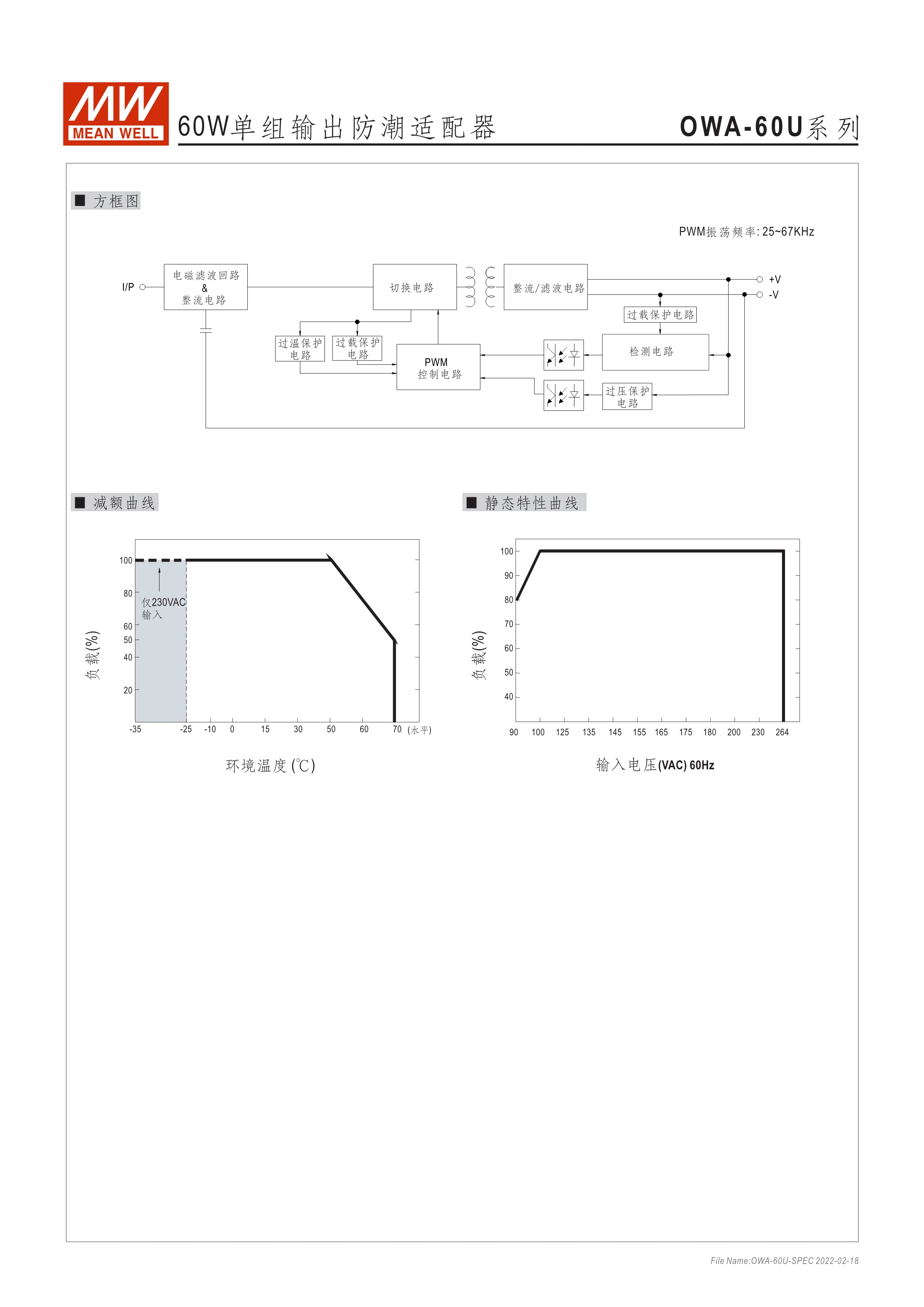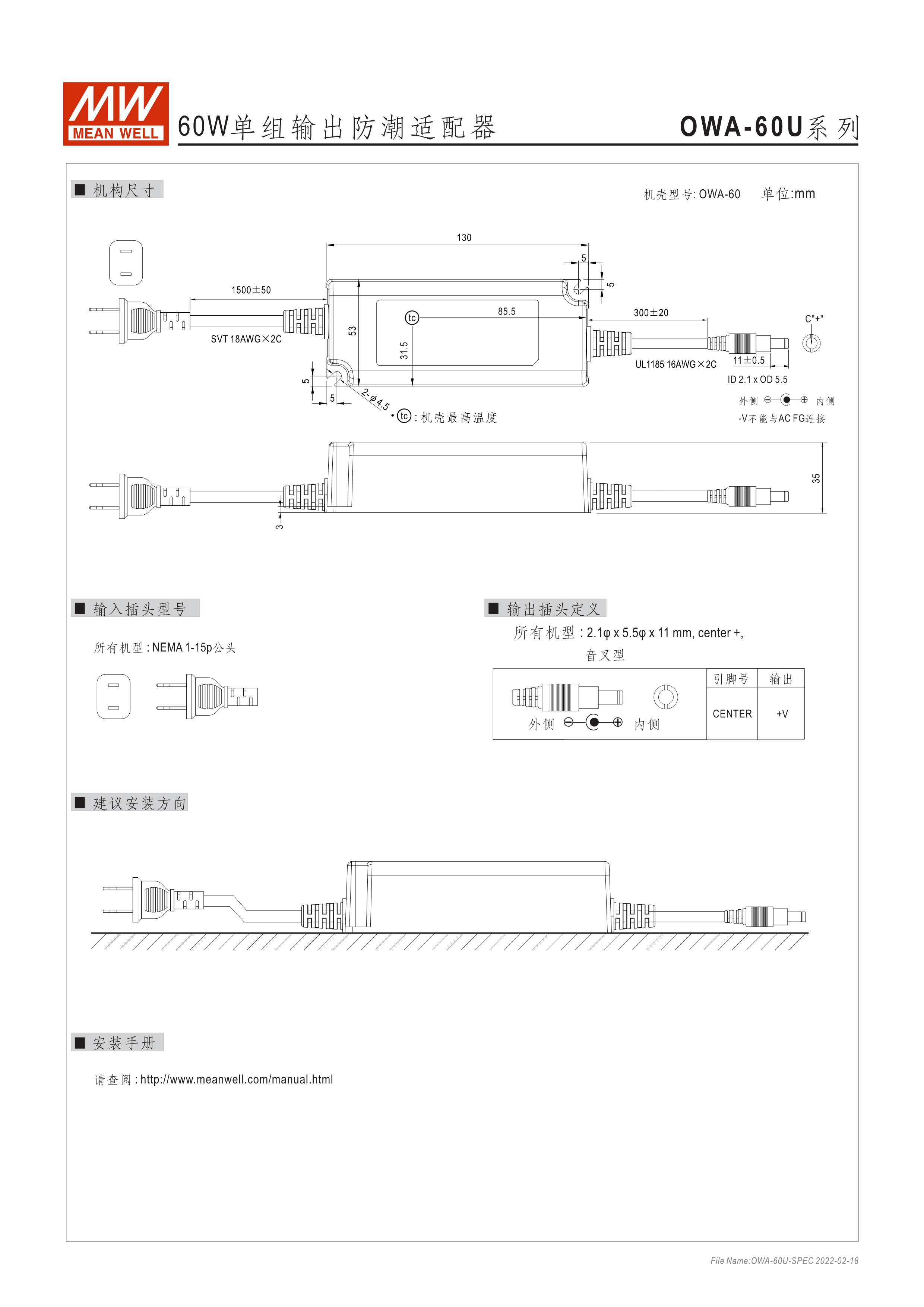 電源主體達IP67防護等級 90~264VAC交流輸入(OWA-120E為180~264VAC交流輸入) 空載損耗<0.15W 能效等級Level VI E型: 符合EU ErP 及 CoC Version 5 (OWA-120E 僅符合EU ErP) U型: 符合EISA 2007/DoE 及 NRCan Class II電源 (無FG) U型:2極美插,E型:2極歐插 多種DC輸出轉接頭可更換 5年保固期