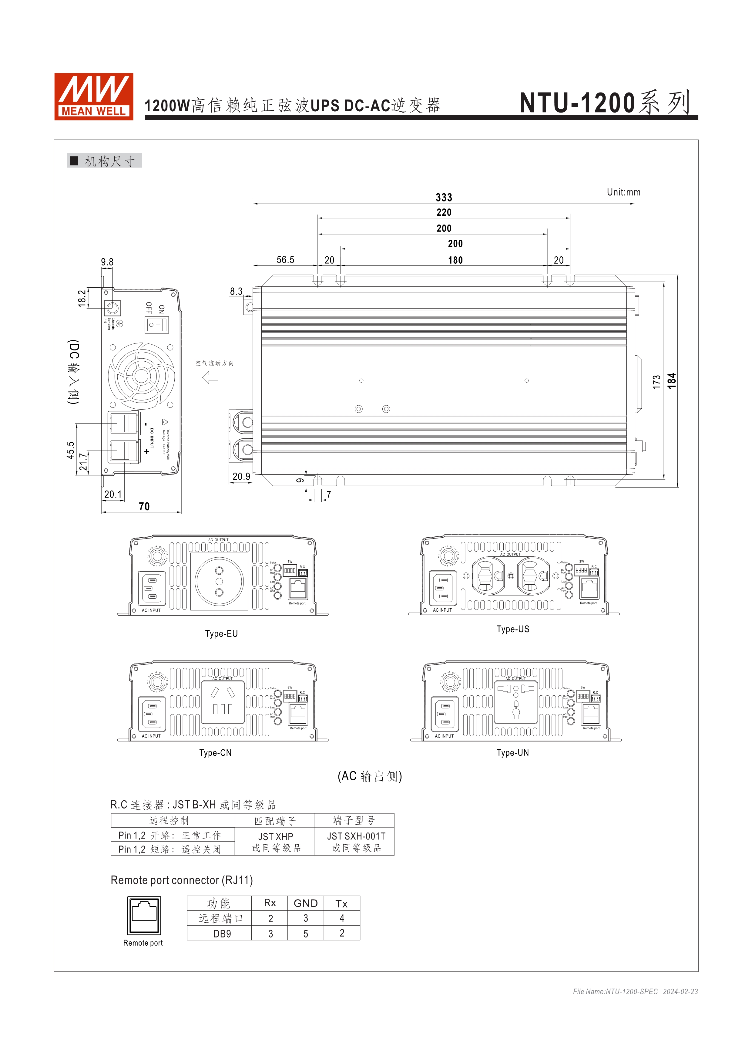 內(nèi)置UPS功能(交流旁路) DC-AC純正弦波輸出 (THD<3%) 可遠(yuǎn)距遙控 (IRC1, IRC2, IRC3) 多重智能保護(hù)功能: DC輸入側(cè) - 極性反接、電壓過低、電壓過高保護(hù) AC輸出側(cè) - 短路、超載、過熱保護(hù)